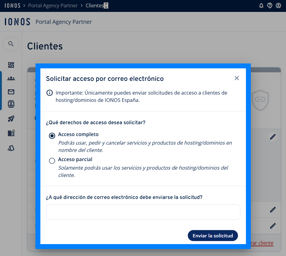 Incorpora a tus clientes en el portal y envíales una solicitud de acceso a su cuenta IONOS. A continuación, tu cliente podrá darte autorización para que tú puedas gestionar sus productos y configuración de cliente.