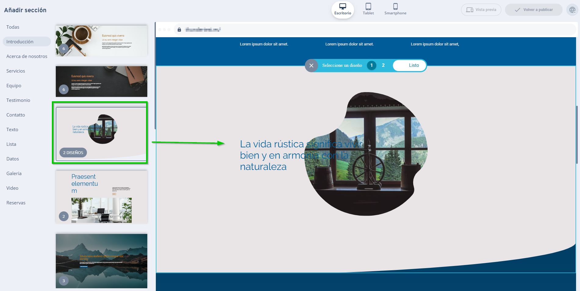 Selecciona la sección deseada y, si es necesario, elige un diseño. A continuación, haz clic en Listo.