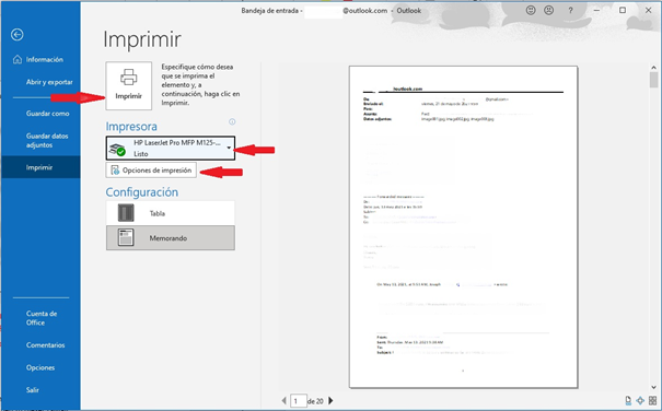 Imprimir correos en el software instalado de Outlook