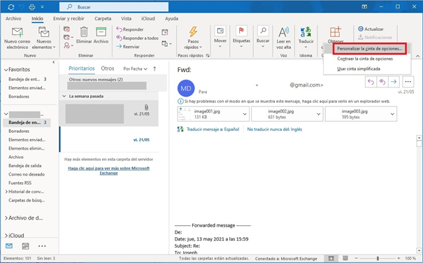 Para que el comando “Imprimir” también aparezca cuando abras un correo en una ventana aparte, has de repetir este proceso en la cinta de opciones del mensaje abierto.