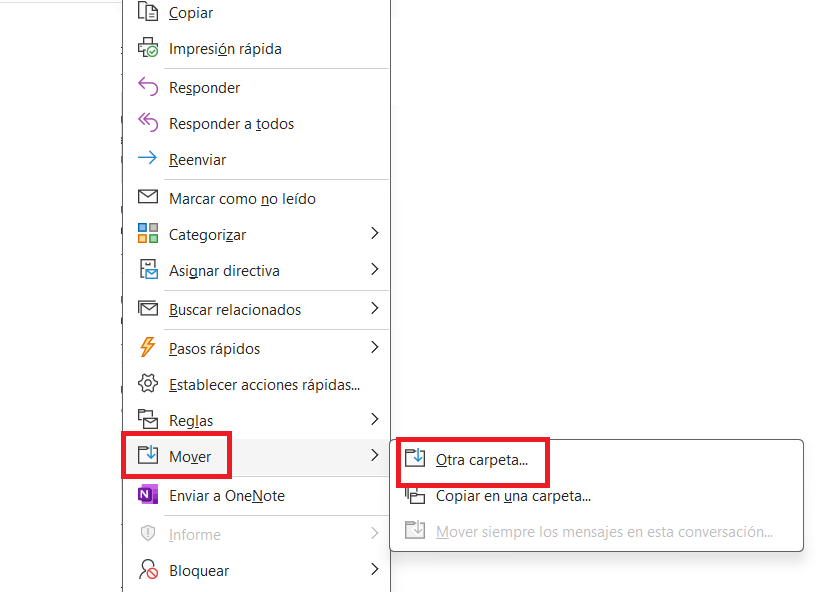 En la carpeta puedes ver todos los correos electrónicos que están en la papelera. Haz clic con el botón derecho del ratón en el correo de Outlook que deseas restaurar y selecciona “Mover” > “Otra carpeta…” en el menú contextual.