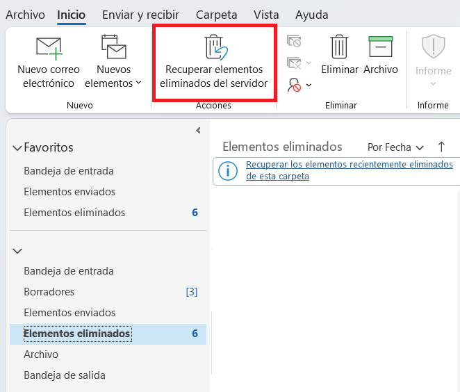 Para ello, accede primero a la pestaña “Inicio” y luego a la carpeta “Elementos eliminados” de la cuenta de correo correspondiente. Si tu cuenta de correo admite la recuperación de correos eliminados de forma definitiva desde el servidor, verás en la cinta de opciones la opción “Recuperar elementos eliminados del servidor”.