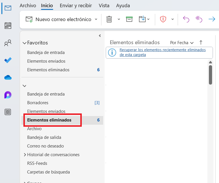 - Abre la carpeta “Elementos eliminados” en tu cuenta de correo.