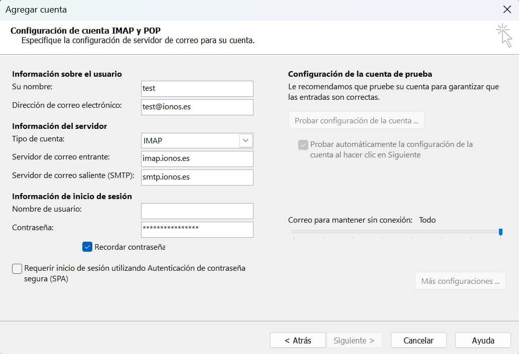 En el apartado “Servidor de salida” podrás introducir el servidor SMTP que prefieras, como por ejemplo el servidor SMTP de IONOS smtp.ionos.es.