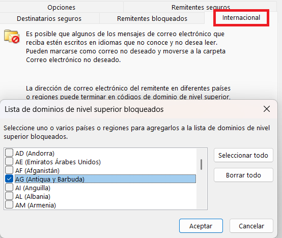Muchos remitentes de spam utilizan direcciones con dominios de países poco conocidos, como pequeños estados insulares en el Pacífico, donde el registro de dominios es más económico. A través de la pestaña “Internacional”, puedes bloquear automáticamente determinados dominios de países de los que probablemente nunca recibirás correos legítimos, marcándolos como spam.