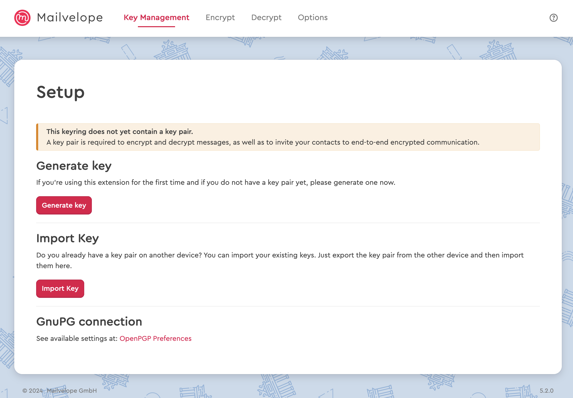 Si prefieres comunicarte a través de servicios de correo electrónico como Gmail, Yahoo, GMX o Outlook.com, la extensión del navegador Mailvelope es una excelente opción para ti. La extensión se basa en OpenPGP.js y está disponible para Google Chrome, Microsoft Edge y Mozilla Firefox. Una vez instalada, verás el icono de Mailvelope en la barra de herramientas de tu navegador, desde donde puedes acceder a la interfaz de usuario. Aquí puedes crear, importar y administrar tus claves, así como las claves públicas de tus contactos, o cargar claves públicas generadas en un servidor de claves público.