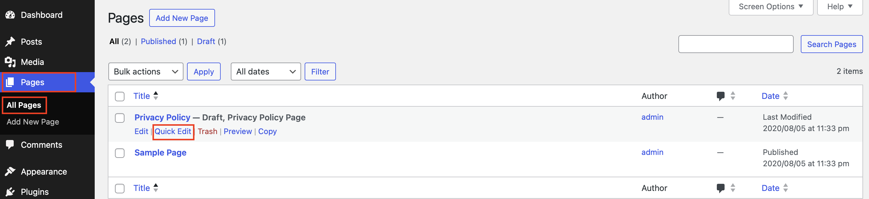 Puedes activar o desactivar los comentarios de WordPress para entradas y páginas concretas usando la función de edición rápida (Quick Edit) en tu backend de WordPress. Como ya hemos mencionado, los comentarios se desactivan automáticamente para las páginas, mientras que se activan automáticamente para las entradas.