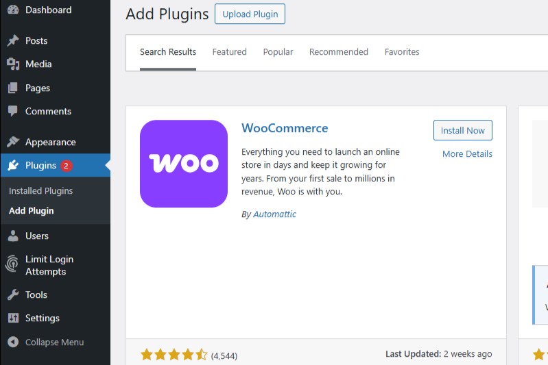 Para usar WooCommerce, primero debes instalar el plugin en WordPress. En el Dashboard, ve a la sección “Plugins” y haz clic en “Añadir nuevo”. Escribe “WooCommerce” en el buscador y, cuando aparezca el plugin, pulsa en “Instalar ahora” y después en “Activar”. Si es la primera vez que lo utilizas, te recomendamos seguir el asistente de instalación integrado, que te guía paso a paso en la configuración inicial.