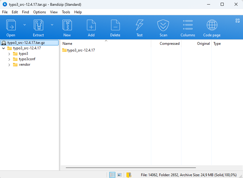 Paso 4: al seleccionar el fichero, se abrirá un archivo comprimido para instalar TYPO3 en el programa de compresión.