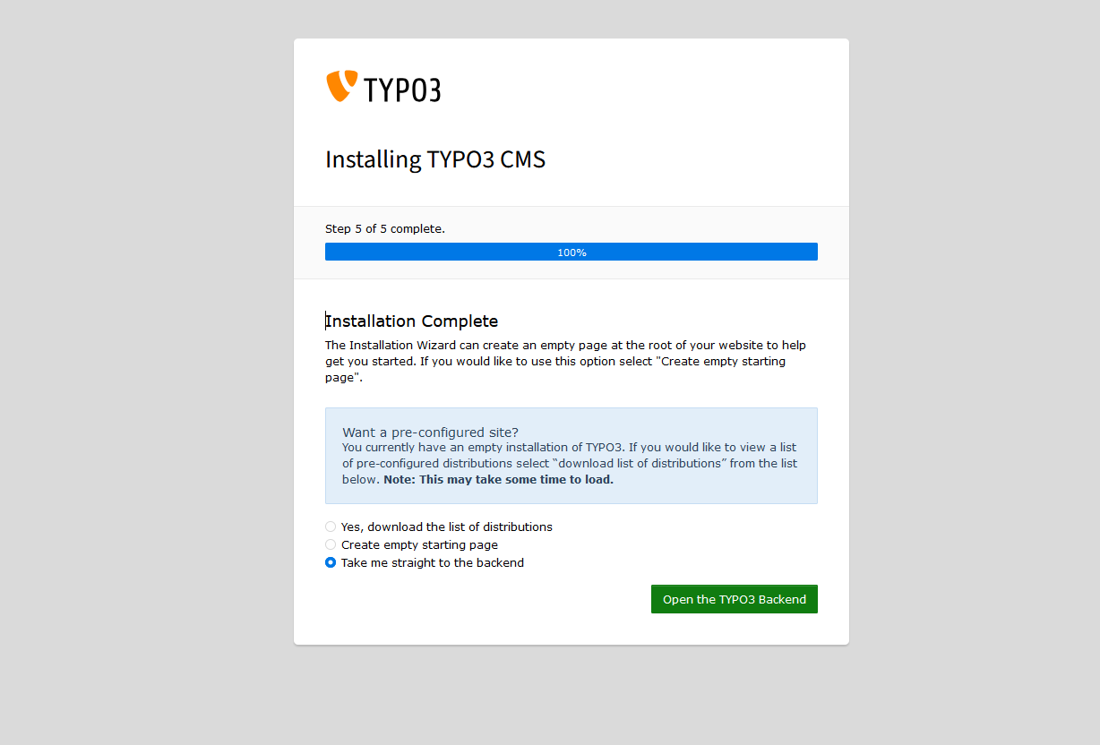 Paso 17: en el último paso el asistente concluye la instalación encargándose de algunos ajustes en tu entorno de sistema, pero aún podrás decidir si el programa crea ya una página en blanco o permanece en pausa por el momento. Haciendo clic en “Open the TYPO3 Backend” te dirigirás al panel de administración, donde podrás registrarte con la cuenta que has creado. Con esto habrás instalado TYPO3 correctamente.