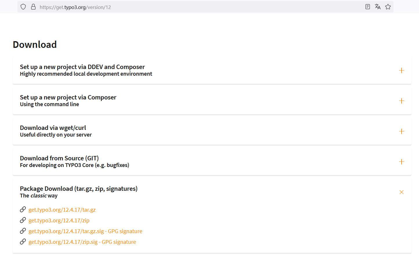 Paso 1: visita la página de descarga de TYPO3, donde encontrarás las versiones actuales de TYPO3 que cuentan con soporte. Los desarrolladores indican en qué se diferencian entre ellas. Selecciona la más adecuada para ti. Por ejemplo, para instalar TYPO3 12 has de pinchar en “Get Version 12”. Desde aquí te dirigirás a la página de descarga.