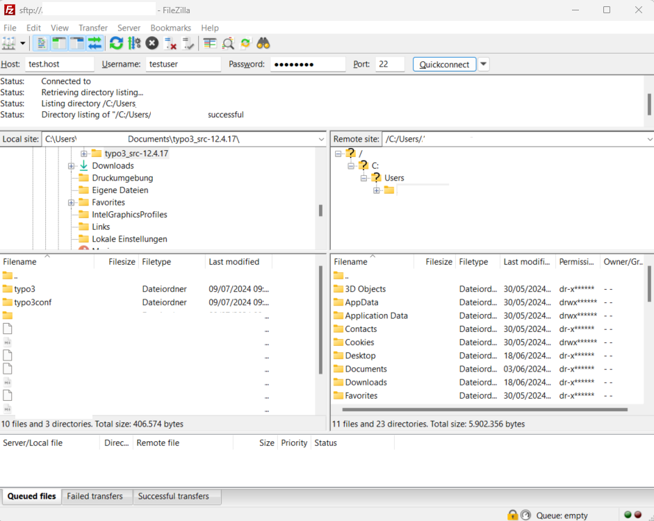 Paso 8: hechos todos los ajustes, traslada la carpeta TYPO3 desde tu disco duro (en la ventana de la izquierda) a la ventana del servidor remoto y colócalo en tu directorio raíz (también directorio de inicio). El símbolo “/” marca el directorio raíz en sistemas tipo Unix.