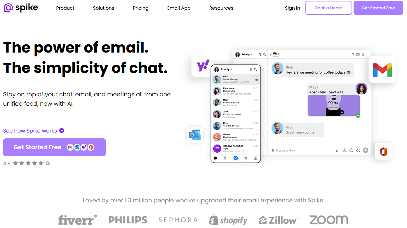 Spike apuesta por estándares y protocolos abiertos con el correo electrónico, lo que significa que puedes comunicarte con tus contactos o clientes incluso si no utilizan Spike. La seguridad de los datos es una prioridad para el equipo de Spike: todos los datos se cifran automáticamente con AES-256 antes de su transmisión. Además, Spike ofrece Magic AI, un asistente de comunicación basado en inteligencia artificial que optimiza los flujos de trabajo, resume contenidos y mejora la productividad.