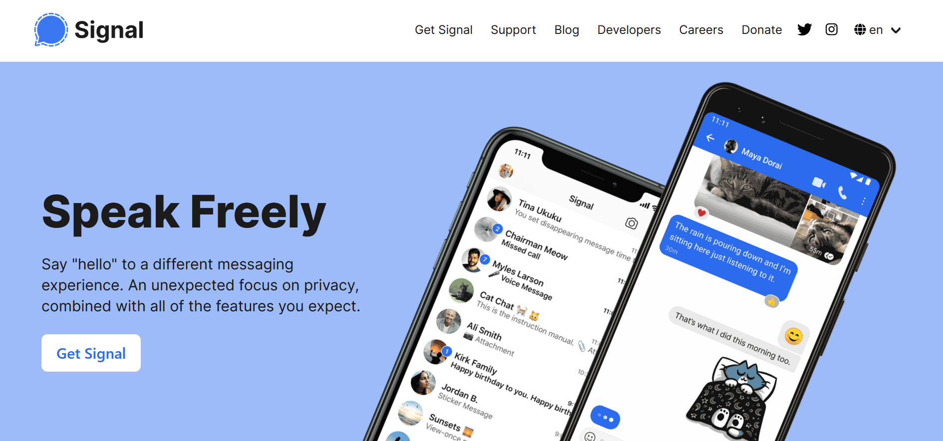La aplicación de Signal no es muy conocida, pero sus desarrolladores sí. Open Whisper Systems, propietaria de Signal, es precisamente la responsable del software open source de cifrado de extremo a extremo que ha servido para que otras aplicaciones como WhatsApp, Telegram y Threema desarrollaran el suyo propio. Edward Snowden usa Signal y el equipo en torno al criptógrafo Moxie Marlinspike, el fundador de Open Whisper Systems, goza de una excelente reputación en los circuitos de seguridad informática. La empresa se financia completamente gracias a becas y donaciones y no depende de la publicidad o del pago de tarifas.