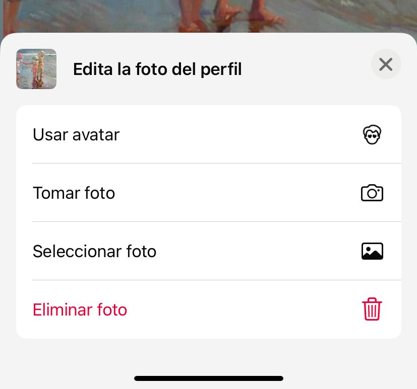 - Una vez dentro de la sección de “Ajustes”, verás justo arriba la foto actual junto a tu nombre de usuario. Si hasta ahora no habías elegido una foto, verás entonces un avatar blanco con fondo gris. Haz clic sobre la foto.