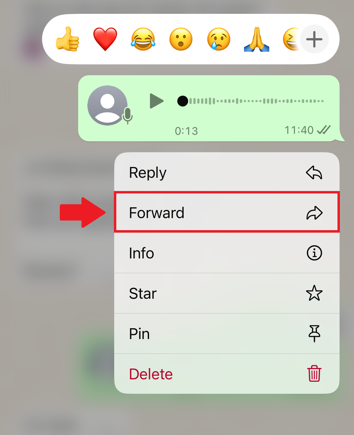 Paso 2: entre las opciones que aparecen, selecciona “Reenviar” (Forward) y luego el símbolo de compartir que hay abajo a la derecha para ver las distintas opciones de reenviar audios.