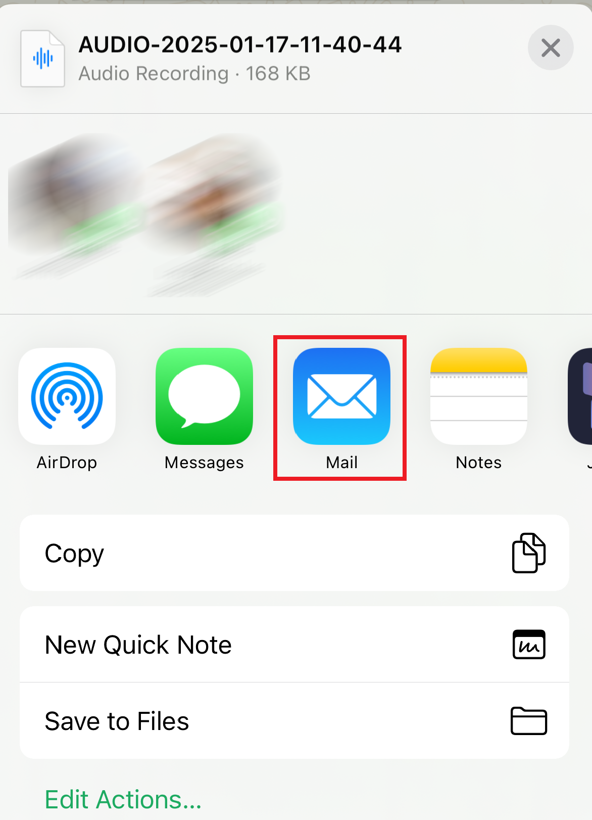 Paso 3: ahora puedes enviarte el audio por correo electrónico para guardarlo luego en tu ordenador (o donde quieras). Si prefieres guardar la grabación en tu móvil, selecciona “Guardar en Archivos” (Save to Files). También puedes reenviarlo a conversaciones en aplicaciones alternativas a WhatsApp como Signal.
