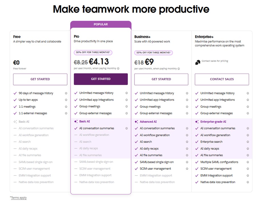 Para equipos con mayores necesidades, existen planes de pago como el plan Pro, desde unos 8.25 € (aprox. 9.70 USD) por persona/mes, y el plan Business+, desde unos 18 € (aprox. 21 USD) por persona/mes). También se pueden solicitar ofertas personalizadas para planes Enterprise. La versión de pago de Slack ofrece, entre otras cosas, archivo de mensajes ilimitado, mayor capacidad de almacenamiento, soporte 24/7, inicio de sesión único basado en SAML (SSO) y funciones avanzadas de seguridad y administración. Por 10 € (aprox. 11.70 USD) por persona/mes, también se puede añadir Slack con IA, que puede utilizarse, por ejemplo, para la creación automatizada de flujos de trabajo o la generación de resúmenes de reuniones (conocidas como huddles).