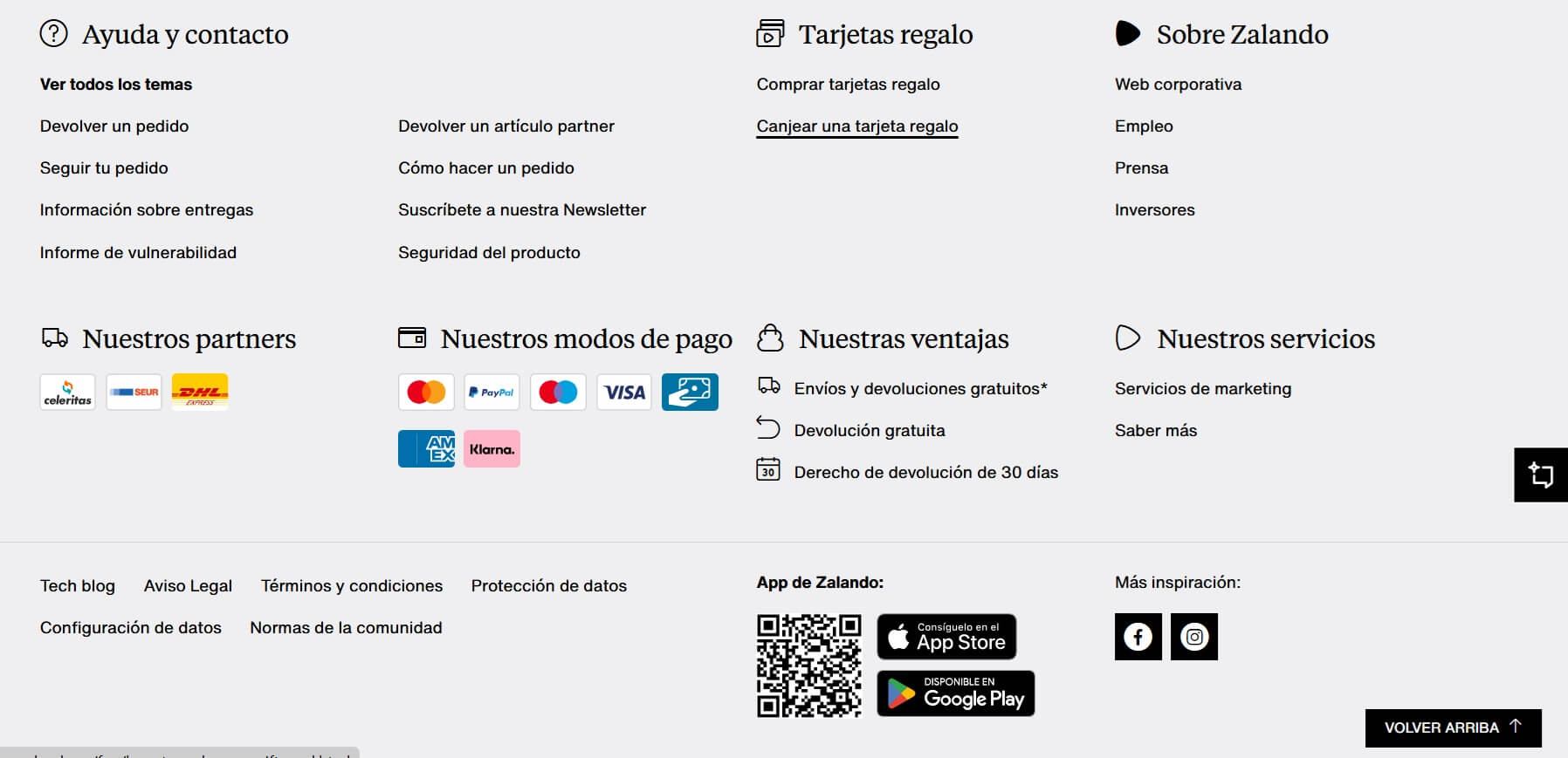 El footer de Zalando también es muy extenso, pero gracias a su estructura clara se mantiene fácil de navegar. Destaca en varios aspectos por su clara orientación al servicio, con apartados como “Cómo hacer un pedido”, “Derecho de devolución de 30 días”, múltiples formas de pago y un listado de socios de envío. Además, incluye todos los enlaces a los textos legales, una sección de “Sobre Zalando” con información sobre socios y ofertas de empleo, así como referencias a sus propias apps móviles y a diferentes cuentas en redes sociales.