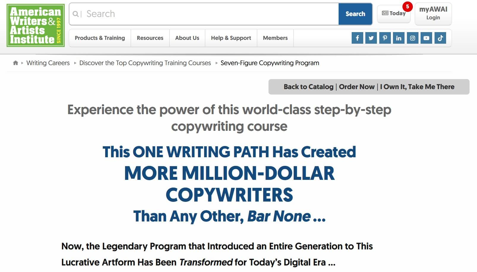 Si buscas inspiración para crear una página de destino, la encontrarás en la página web de la American Association for Writers (AWAI). La asociación de redactores publicitarios anuncia sus cursos utilizando las clásicas landing pages: