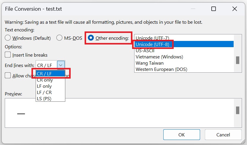 Se abre la ventana emergente ”Conversión de archivo”. En ”Codificación de texto”, seleccione la opción ”Otra codificación” y de la lista, elija ”Unicode (UTF-8)”. En el menú desplegable ”Finalizar líneas con”, seleccione “Retorno de carro/salto de celda” o “CR/LF”. Así de fácil se convierte un archivo al conjunto de caracteres Unicode con UTF-8.