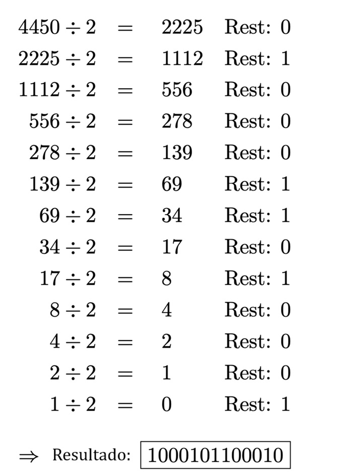 4450 es el número decimal calculado que tendrá que convertirse en un número binario. Para ello ha de dividirse por 2 hasta que el resultado sea 0. El valor Rest, escrito de derecha a izquierda, es el número binario.