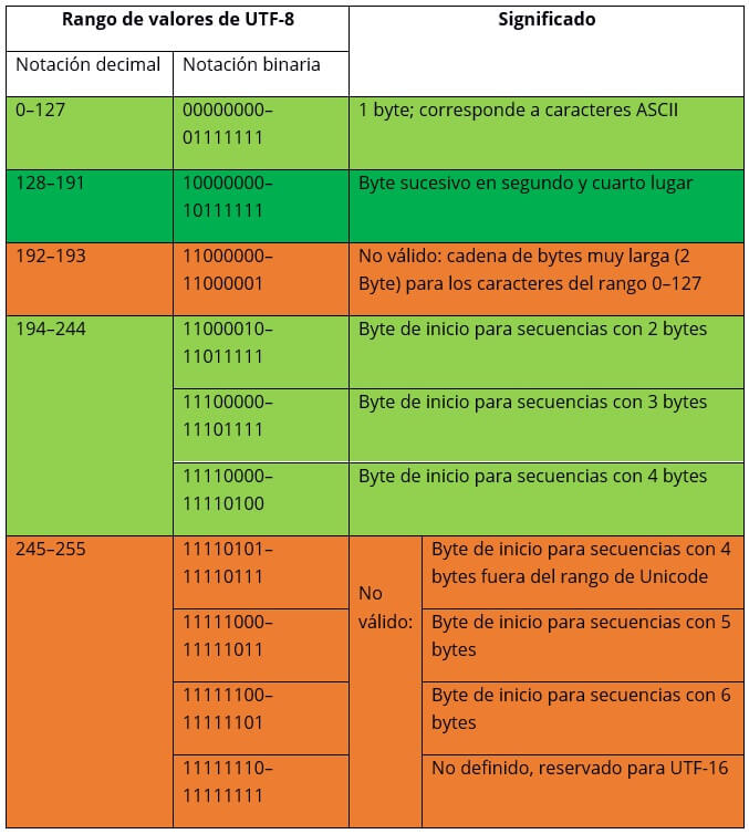 Esta regla es la razón por la que las secuencias de bytes que comienzan con 192 y 193 no son válidas. Esto se debe a que representan potencialmente caracteres en el rango ASCII (0–127) con 2 bytes, cuando ya están codificados con 1 byte.