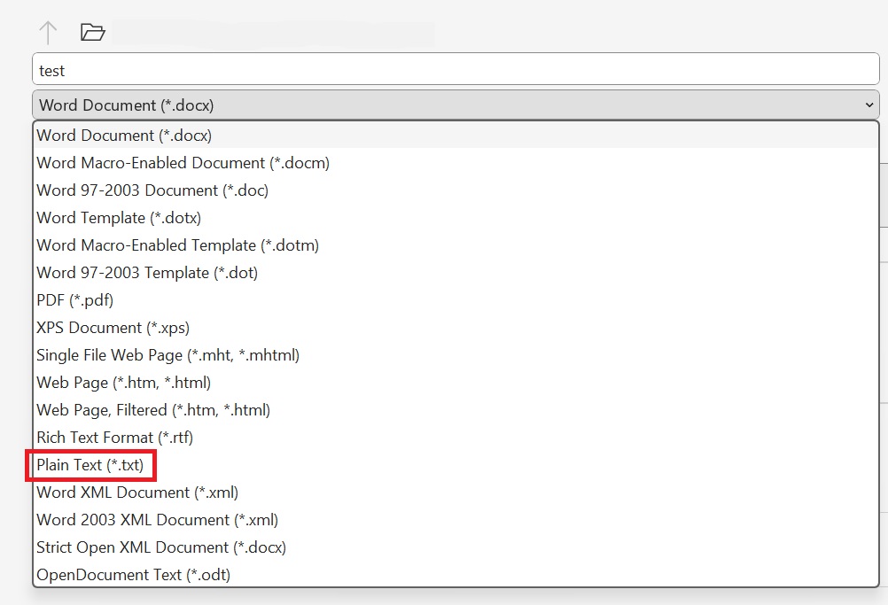 UTF-8 es el estándar más utilizado en Internet. Sin embargo, algunos editores sencillos almacenan texto, pero no necesariamente en este formato. Microsoft Notepad, por ejemplo, utiliza normalmente una codificación conocida como “ANSI”, tras la que se esconde la codificación “Windows-1252” basada en ASCII. Para convertir un archivo de texto de Microsoft Word a UTF-8 (por ejemplo, para reproducir diferentes sistemas de escritura), sigue estos pasos: en “Guardar como” (“Save As”) selecciona la opción “Texto sin formato” (“Plain text”) en Tipo (“Save as type”).