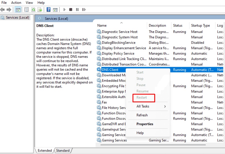 - Si el servicio no se está ejecutando, haz clic con el botón derecho sobre “Cliente DNS” (DNS Client) y selecciona “Reiniciar” (Restart).