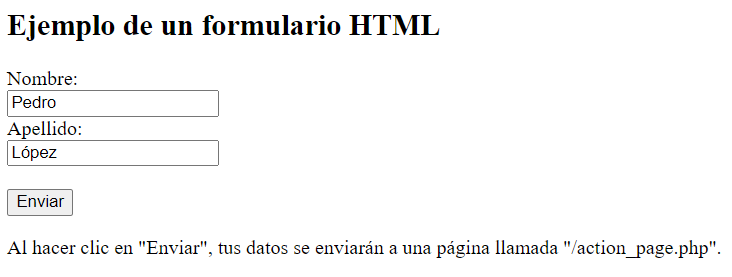 <p>Al hacer clic en "Enviar", tus datos se enviarán a una página llamada "/action_page.php".</p>