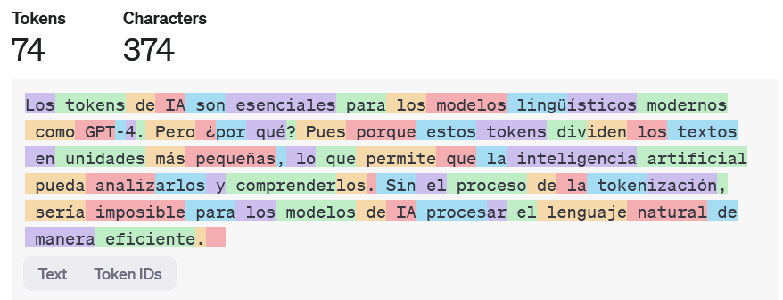 Un ejemplo de tokenizador accesible es el OpenAI Tokenizer, diseñado para los modelos de ChatGPT actuales. Tras introducir el texto en el campo de entrada, la herramienta muestra cada uno de los tokens de IA resaltados en color.