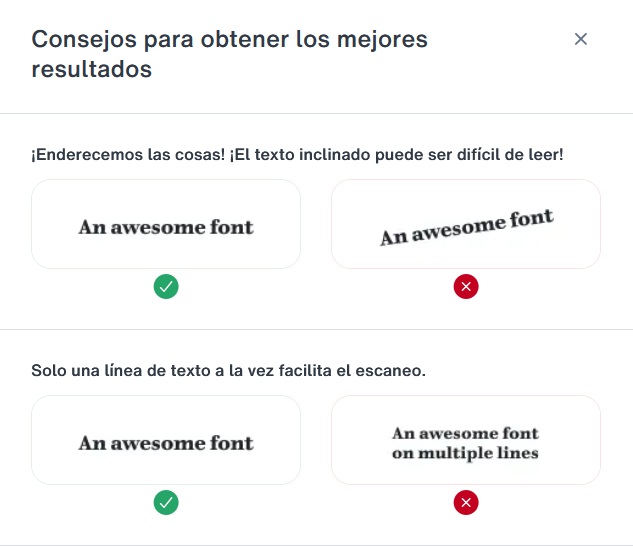 Ten en cuenta las recomendaciones de la herramienta para las capturas: WhatTheFont funciona mejor si la imagen tiene buena calidad. El fragmento debe incluir suficientes letras representativas de la fuente y estar, a ser posible, en orientación horizontal. También se recomienda que el texto esté en alfabeto latino. Para obtener mejores resultados, intenta que el texto esté en una sola línea y que las letras no se toquen entre sí.