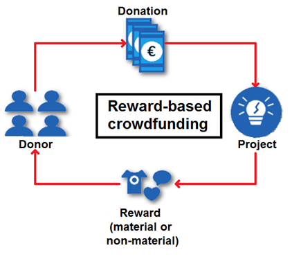 Es el tipo de crowdfunding clásico y consiste en reunir fondos a partir de diversas aportaciones y prometer como contrapartida la realización del producto final. Además, a menudo se dan a los participantes compensaciones inmateriales (inclusión en los créditos, acceso a la versión beta, prioridad en los pedidos, etc.) o materiales (merchandising, prototipos, etc.). Es por ello por lo que se usa el término “recompensa” en su denominación. Normalmente, esta recompensa depende de la cantidad donada.