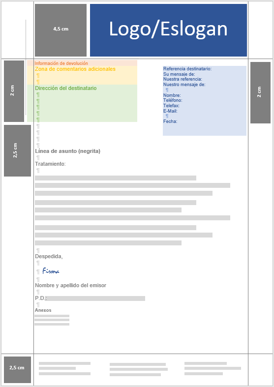 La parte superior del membrete corresponde al borde superior del documento. A partir del borde de la página, dispones de 4,5 cm para tu diseño. En esta área, los empresarios suelen colocar elementos gráficos como logotipos de empresas o eslóganes.