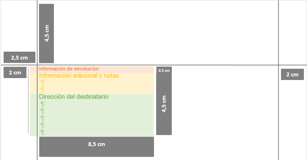 La información de devolución va seguida de una zona de información adicional de 3 líneas y una zona de notas con una altura total de 12,7 cm. Las 6 líneas restantes del campo de dirección están destinadas a la dirección del destinatario.
