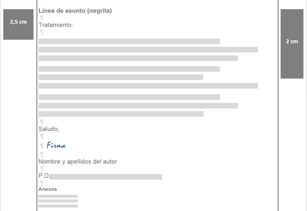 El bloque de información va seguido de la línea de asunto y ambos se separan con un espacio mínimo de 2 líneas en blanco.
