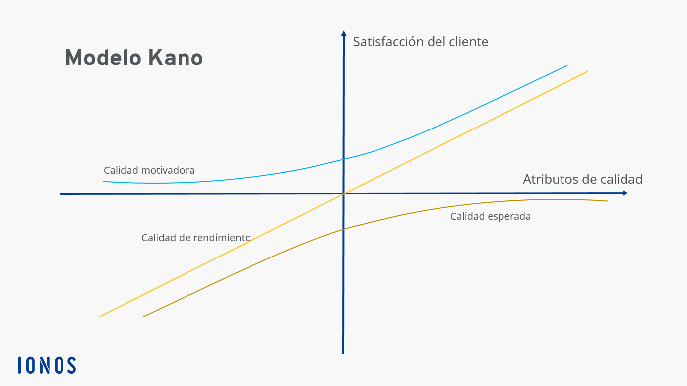 El siguiente diagrama aclara el modelo Kano y muestra cómo repercuten las mejoras en los diferentes tipos de satisfacción. En el diagrama solo están presentes las tres primeras categorías, por ser las más importantes en la toma de decisiones empresariales.