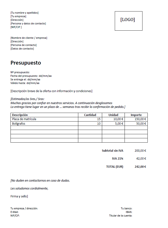 - Al final del listado de productos o servicios que se presupuestan se indica el precio total libre de impuestos, el porcentaje y el importe correspondiente de IVA (si procede) y el importe total resultante de la factura.