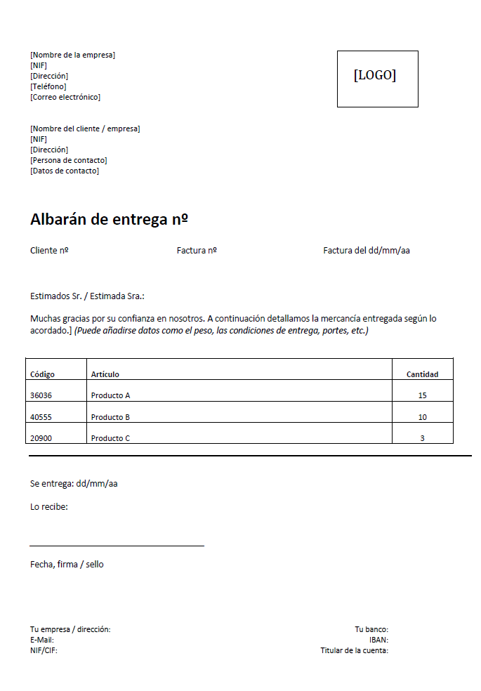 Los albaranes son documentos comerciales que, principalmente, registran por escrito las mercancías enviadas. Otra posibilidad es su envío digital a través de correo electrónico. Su diseño y contenido se logran fácilmente con un procesador de texto ordinario o con un programa de hojas de cálculo. Para evitar crear un nuevo documento para cada envío de mercancías, muchos usuarios suelen recurrir a modelos de albarán de entrega (también llamados modelos de nota de entrega) que puedes crear tú mismo o descargar de Internet. Por lo general, se trata de documentos en Word o Excel que se pueden personalizar de forma gratuita.