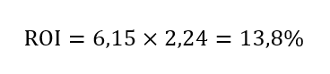 Si ahora multiplicamos los réditos circulantes (margen de beneficio) por la rotación de activo obtenemos para el periodo contable considerado un ROI de 13,8 %.