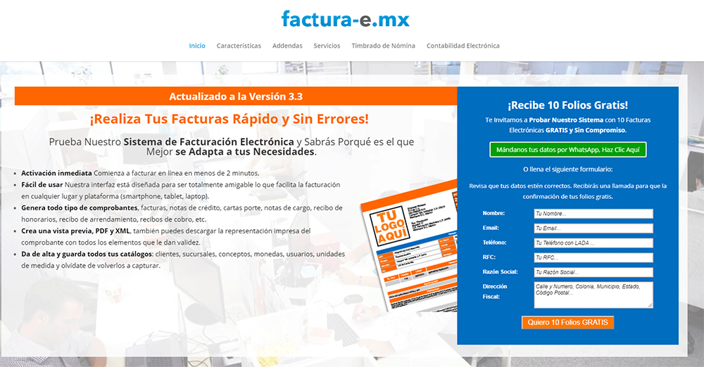 | Facturador.com | Empresas o profesionistas independientes | Permite personalizar las facturas | A través de un portal web (laptop, tablet, smartphone) | Cuenta con distintos paquetes de folios dependiendo del negocio | 10 folios gratuitos |