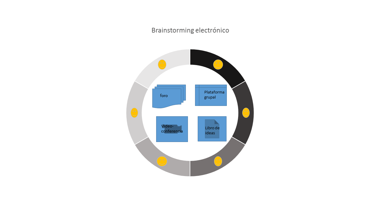 | Brainstorming electrónico | No está supeditado a una hora y un lugar, puede ser anónimo, óptimo para empleados introvertidos, mejor registro de ideas | Menos espontaneidad, flujo de ideas irregular, obstáculos técnicos | Grupos grandes, grupos con participantes introvertidos o grupos internacionales |