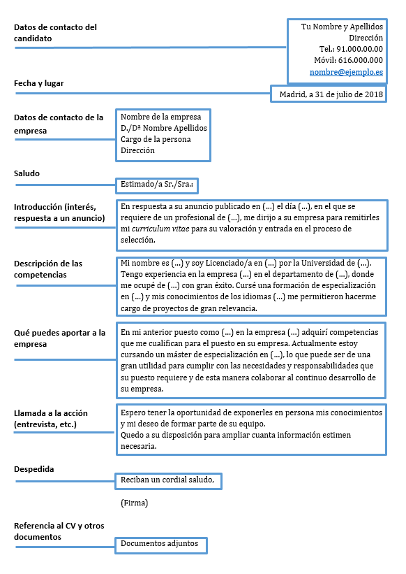 Como en el caso de cualquier otro tipo de texto formal, también se ha consolidado una cierta estructura para la carta de presentación laboral. Y es que la misma función de la carta hace necesario que el hipotético lector encuentre rápidamente la información más importante sobre la motivación y las cualificaciones del candidato. Aunque la carta ha de ajustarse a la oferta y la empresa, no se trata de hacer alarde de creatividad, sino de transmitir lo más importante de la forma más concisa posible. Si te ciñes a la estructura habitual, el lector sabrá dónde encontrar lo que busca. En la siguiente imagen se aprecia la estructura formal de una carta de presentación: