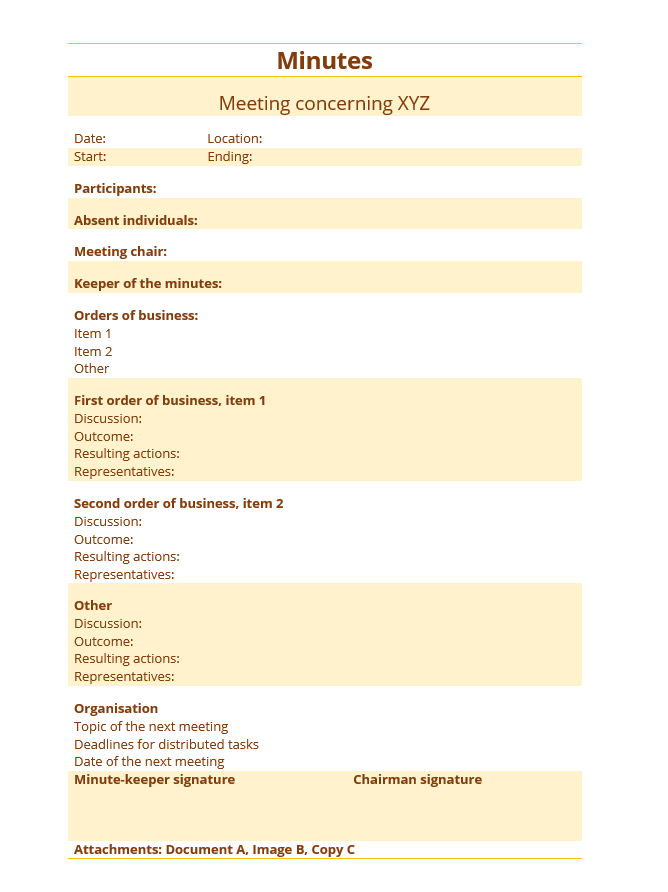 Una estructura clara aumentará la legibilidad del acta y, además, si utilizas un formato uniforme en todos los casos, los participantes se acostumbrarán a una estructura fija y se familiarizarán rápidamente con ella. Por lo tanto, puede ser útil crear un modelo de acta de reunión. La siguiente información debe constar en cada acta: