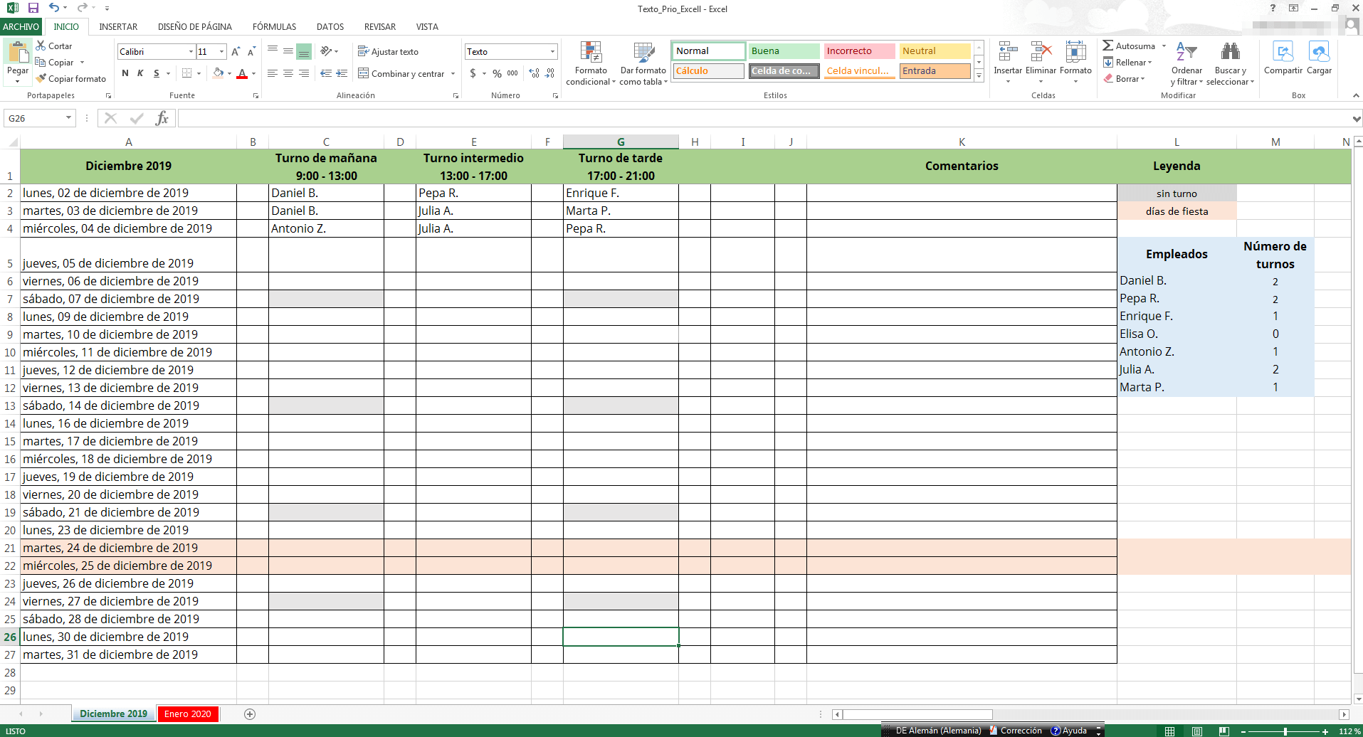 - ¿Quieres saber cómo formatear las celdas para cada uno de los turnos? Escribe “Turno de mañana” (intermedio o de tarde) y debajo la hora correspondiente. Para ello es necesario introducir un salto de línea con ALT+ENTER. Además, haciendo clic en la celda se puede ajustar el tamaño de fuente y añadir negritas.