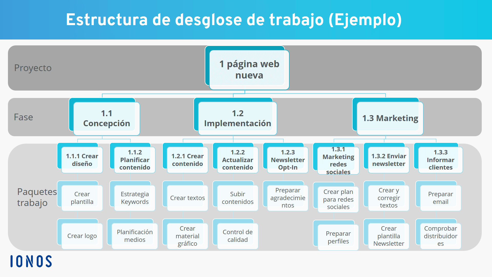 - Estructura de desglose del trabajo: clasifica las tareas a realizar en proyectos parciales y paquetes de trabajo.