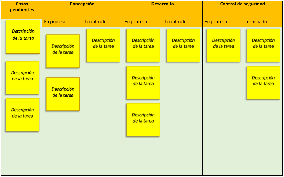 La técnica de visualización funciona de la siguiente manera: la tabla Kanban se divide primero en columnas y filas. Para la primera columna hay diferentes nombres (“Pendiente”, “Por hacer”, “Tarea” o “Aún por solucionar”); siempre se incluyen en ella aquellas tareas que son necesarias para la implementación del proyecto pero que todavía no se han iniciado. Las siguientes columnas representan pasos individuales del proceso. Por ejemplo, la secuencia "Backlog", “Análisis”, “Desarrollo”, “Test” es común. Sin embargo, también son posibles repartos más sencillos y, según el proyecto, también útiles, como “Tarea”, “En proceso” y “Concluido”. Para proyectos más complejos, se pueden subdividir los pasos de proceso individuales con mayor precisión (como se muestra en la figura anterior). Dependiendo del tipo de proyecto, son útiles las columnas adicionales como “Confirmado por el cliente o la dirección”, “En espera”, “Preparación de la producción” o “Atrasado”.