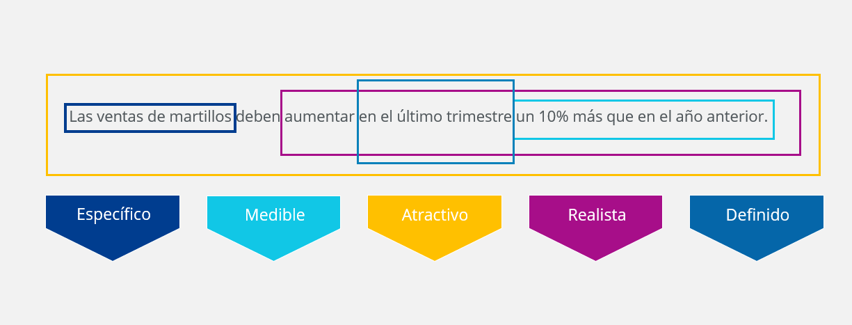 Según Locke y Latham, los objetivos personales y profesionales funcionan mejor si se formulan según los criterios SMART. Estos establecen que un objetivo debe ser: specific (específico), measurable (medible), attractive (atractivo), realistic (realista), time-bound (finito). En algunos casos se usan otras palabras, pero con el mismo significado que en este caso.
