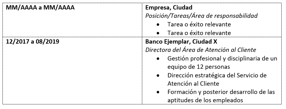 Por ejemplo, formatea la información sobre tu experiencia profesional de la siguiente manera: