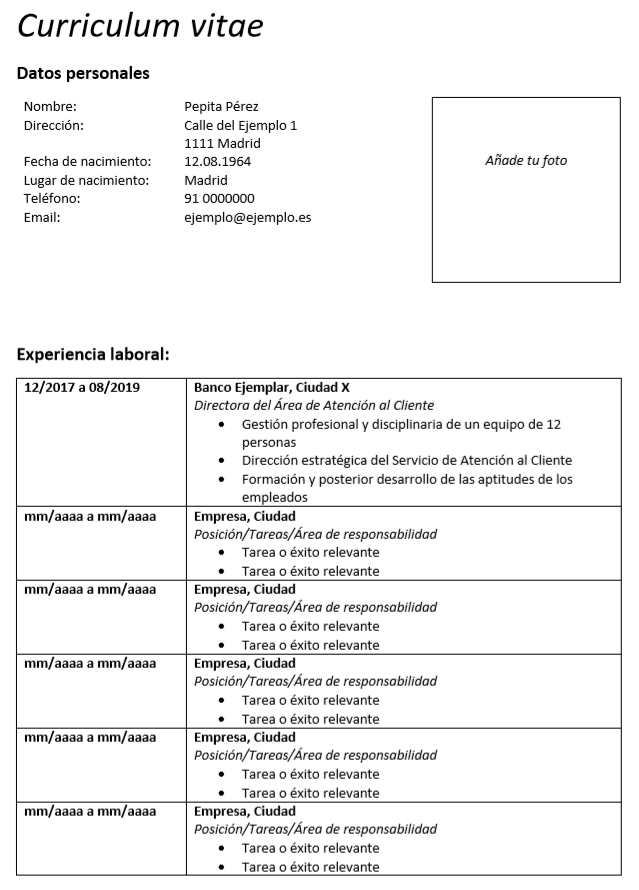 Hoy en día, los encargados de RR. HH. esperan un CV presentado en formato tabular. Este documento no debe constar de más de dos páginas para simplificar el trabajo al lector, que puede obtener una visión general de la carrera profesional del solicitante rápidamente.